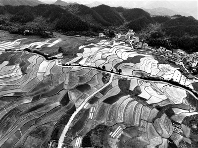 近段时间,江西省遂川县巾石乡密岭村山区刚刚灌水的一丘丘稻田波光粼粼,变成一道道令人惊艳的曲线,既显雄浑秀丽,又散发着浓郁的艺术情调,加上山川、树木、房舍点缀其中,绘就了一幅乡村水彩画。李建平 摄