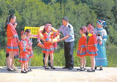 7月23日,贵州省黔西市公安局谷里派出所民警来到自治村沙坝河边,开展以“‘警’防溺水 安全度假”为主题的教育活动,向当地布依族孩子讲解暑期防溺水知识和救生圈的使用方法,提高孩子们知危险、会避险的意识和自我保护能力。图为活动现场。周训超 摄