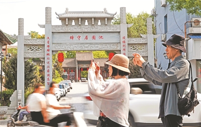 5月19日,在山西省运城市,尽管最高气温达35摄氏度,当地各县市重点旅游景区景点减免60岁以上老年人首道门票,为市民和游客提供免费乘坐直通车游全市等多项惠“游”暖心旅游举措,仍吸引了众多游客。图为两名游客(右)在新绛绛守居园池前拍照留念。高新生 摄