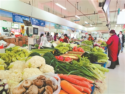 在蜀天农贸市场兴茂店,居民正在选购新鲜的蔬菜。 罗园 摄