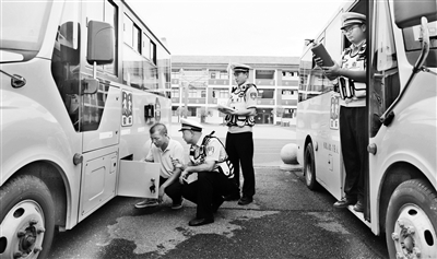 新学期开学在即,为确保校车安全运行,江西省新余市渝水区开展校车安全专项大检查,组织公安交警和相关技术人员对辖区校车信息资料、校车司机驾驶资格、校车安全性能和随车配备的安全应急器材等进行检查,消除校车安全隐患。图为8月22日,新余市公安交警支队渝水大队民警在对珠珊中心幼儿园的校车进行安全检查。廖海金 摄