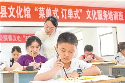 8月19日,在湖北省黄冈市英山县文化馆“暑假公益托管班”,工作人员在指导社区儿童练习书法。暑假以来,英山县文化馆发挥专业特长,组织开展“菜单式、订单式”公益培训班,丰富孩子们暑假文化生活。王江 摄
