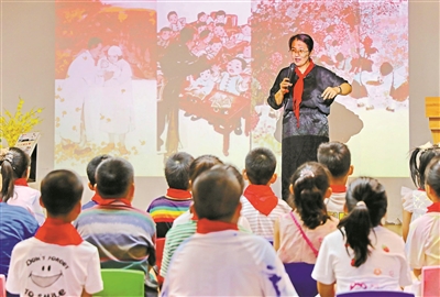 近期,河北省秦皇岛市总工会结合实际情况启动“书香润童心 工会伴成长”爱心托管服务项目,探索创新推出“图书+托管”形式,选择书店作为服务阵地,充分利用其文化资源优势,既盘活公共文化资源,又为职工提供有品质的托管服务。图为8月3日,小朋友在书店内跟随教师学习榜样故事《稻田里的追梦者》。 曹建雄 摄
