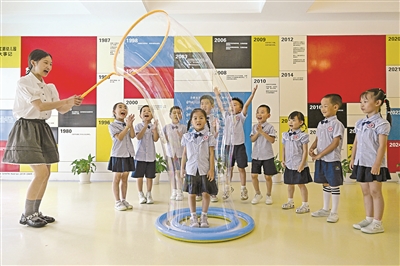 9月17日,安徽省合肥市庐阳区长江路幼儿园教育集团总园开展“科普向未来”全国科普日主题活动。通过体验趣味科普器材、观看科学小实验等环节让小朋友零距离感受科技带来的乐趣和魅力。图为小朋友正在体验科普设备,学习科技知识。 赵明 摄