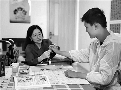 刘晓清(左)在特殊教育学校指导学生练习书法。(受访者供图)