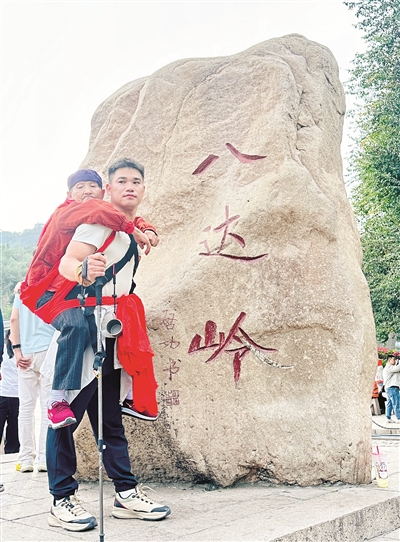 10月4日,他带着母亲前往八达岭长城。抵达八达岭寄存轮椅后,他背好体重100多斤的母亲,一路攀登、走走停停,背带上“带母亲看北京”的字样在人群中格外醒目。“上次背妈妈爬剑门关总有人问身份,这样就能减少解释,保存精力专心照顾妈妈。”他解释道。