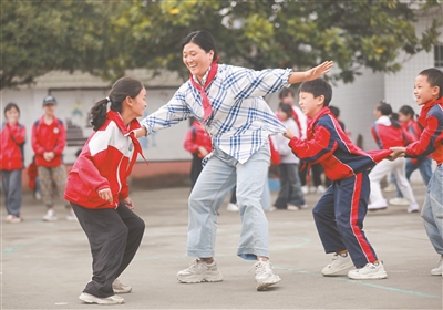 近年来,贵州省黔西市绿化白族彝族乡培育小学常态化开展形式多样、内容丰富的“多彩大课间”活动,结合学生兴趣与学校特色推出创新项目,着力打造健康、快乐、充满活力的校园文化。图为10月13日,老师带领学生们在大课间玩老鹰捉小鸡游戏。