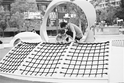 8月31日傍晚,咸宁市图书馆旁的绿地上,新添的爬网处已有孩子的身影。欢快的笑声,白色天幕下奔跑的身影,与夕阳构成一幅美丽画面。