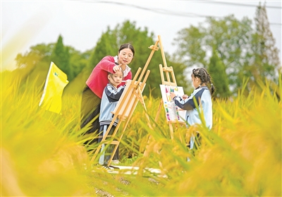 丰收时节,浙江省湖州市长兴县开发区中心幼儿园组织小朋友们走出校园,来到金色稻田间绘画写生,感受秋天气息,描绘家乡丰收美景。陈海伟 摄