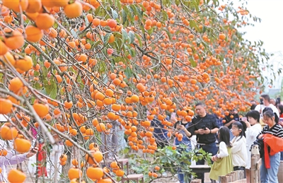近年来,四川省乐山市五通桥区汤家坝村因地制宜发展特色产业,大力推进柿子种植,走出一条以柿子产业为依托,推动农文旅融合发展的新路子。图为10月19日,该村红彤彤的柿子成为小山村一道亮丽的风景线,吸引游客前来游玩。
