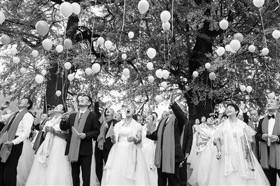 10月28日,四川省华蓥市100对身穿婚礼服装的老年夫妻,来到华蓥山千年“夫妻银杏”树下,在市民的祝福中参加重阳节金婚银婚纪念活动。图为参加活动的老年夫妻放飞心愿气球。邱海鹰 任丹 摄