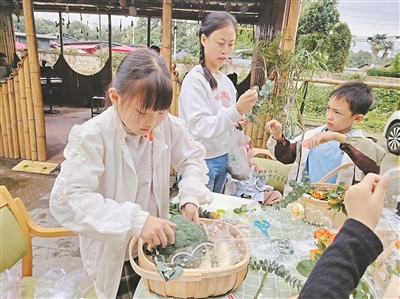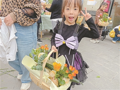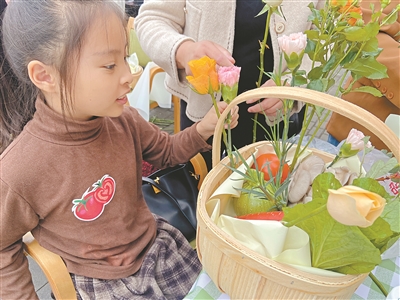采购结束后,孩子们并没有直接回家,而是将亲手挑选的蔬菜与鲜花巧妙搭配,制作成一个个独一无二的“蔬果花篮”。