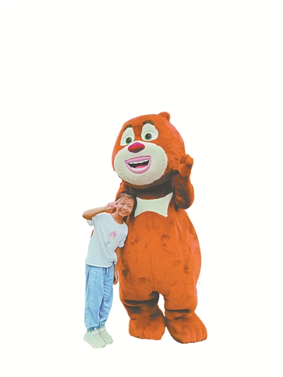 四川绵阳方特乐园,游客与NPC“熊二”互动。周洁 摄