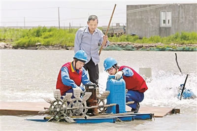 李永军(左一)和同事为渔民养殖塘开展安全用电检查。