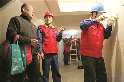李永军(左二)与同事们走进老旧小区,更换楼道内损坏的灯泡、开关等。