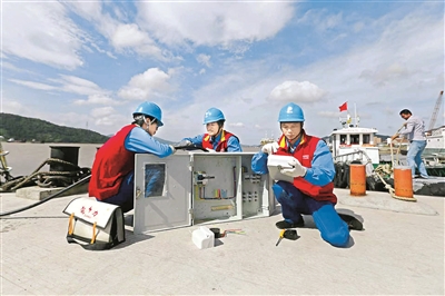 李永军(左三)和同事在码头安装岸电分支箱。