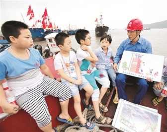 李永军(右一)结合渔民日常用电场景,为儿童科普电力安全要点。