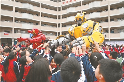 11月6日,四川省内江市东兴区教育和体育局、科协等部门在东兴区外国语小学校举办第八届“科技创新 强国有我”青少年科技文化节。机器人表演、科学小实验、科技小制作等活动吸引学生们前来体验,感受科技带来的乐趣。图为学生们和机甲人互动。兰自涛 摄