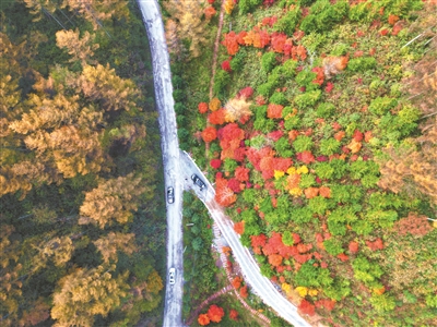 11月5日,车辆行驶在重庆市巫山县骡坪镇通往梨子坪森林公园五彩斑斓的公路上。近年来,巫山县积极探索“交通+旅游+生态”的发展模式,打造“路景一体”观光带,促进乡村旅游高质量发展,推动乡村全面振兴。王忠虎 摄