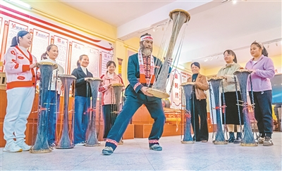 近年来,广西来宾市金秀瑶族自治县以非遗传承基地、非遗工作室、非遗公益课堂等为载体开设专题培训,通过“师徒结对+数字化教学”等模式,系统传授非遗技艺。图为11月11日,在金秀瑶族自治县罗香乡罗运村黄泥鼓舞传承基地,国家级非物质文化遗产黄泥鼓舞代表性传承人盘金海向金秀瑶族自治县幼儿园的教师传授黄泥鼓舞技艺。高如金 摄
