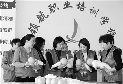 今年以来,山东省青岛市即墨区围绕技能就业、技能成才、技能增收目标,以“即培业丰”带岗培训为抓手,通过需求精准摸排、多元资源整合、全链条服务保障等举措,开展电工、焊工、育婴师、汽修等工种的公益性技能培训。图为11月5日,学员们在老师的指导下参加育婴师培训。梁孝鹏 摄