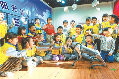 11月12日,新疆乌鲁木齐市天山区幸福路街道幸福园社区联合辖区美睿阳光幼儿园开展“体验科技魅力,点亮科学梦想”主题科普活动。孩子们通过学习科普知识、观看和体验科学小实验等内容,培养爱科学、学科学、用科学的科学素养。图为孩子们与机器狗互动。孙振嵩 摄