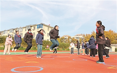 近年来,江苏省连云港市通过优化作息、开足体育课、丰富课间及课后活动,有效保障中小学生每天体育锻炼时间不少于2小时,强化体能训练,促进身心健康。图为11月20日,在大庆路小学,小学生在上体育课。耿玉和 摄