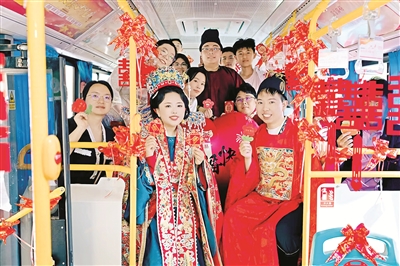 日前,湖北省仙桃市一对新人举行婚礼仪式,接新娘的车辆很特别,是一辆被打扮得“花枝招展”的公交车。车身上绘有新人的卡通图案和各式各样的幸福标语,车头、车窗贴着“囍”字;车内则铺着大红地毯、挂着流苏彩带、摆着婚礼果盘,连扶手都贴有“执子之手,与子偕老”的祝福语。选用“公交婚车”接新娘不仅时尚、氛围感十足,承载着爱与祝福,能让更多人分享新人的幸福,也成为仙桃市推进婚事简办、倡导文明新风的生动缩影。