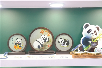 熊猫文创集市上,融合熊猫元素的羌绣作品。