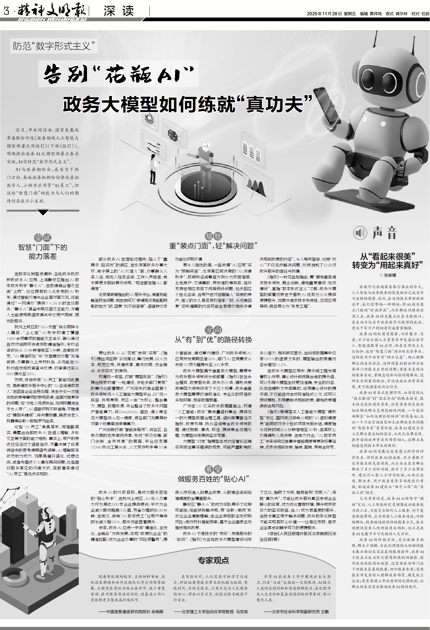 政务AI不是技术的“秀场”,而是服务的“战场”。《指引》为各地政务大模型建设划定了红线、指明了方向。唯有告别“花瓶AI”,练就“真功夫”,才能让政务服务真正走进企业群众的日常,成为优化营商环境、提升城市软实力的坚实底座。当AI成为有温度的服务,当技术真正用于解决问题,政务数字化转型才能实现其核心价值——让每位市民、每家企业享受到触手可及的便捷服务。
