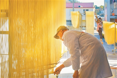 眼下,安徽省安庆市岳西县手工挂面迎来产销旺季,当地手艺人正加紧制作,确保市场供应。近年来,岳西县通过“公司+合作社+农户”的联动模式,把岳西豆粑、手工挂面、手工粉丝等非遗项目与传统手工艺品转化为农户增收致富的特色产业,实现传承与发展双赢,增加村民收入,助力乡村全面振兴。图为12月3日,在岳西县莲云乡珠屋村,村民在制作手工挂面。吴均奇 摄