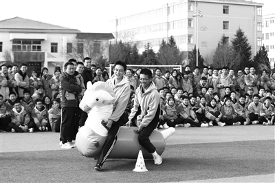 为缓解高三学生应考压力,甘肃省平凉市第五中学通过开展形式多样的心理减压趣味活动,帮助学生释放心理压力、增强信心。图为12月6日,学生们参加心理减压趣味活动。吴希会 摄
