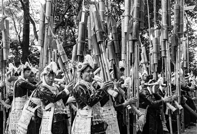 12月8日,贵州省黔东南苗族侗族自治州从江县丙妹镇岜沙苗寨迎来一年一度的传统芦笙节,当地苗族同胞欢聚一堂载歌载舞,庆祝丰收。图为芦笙手在吹奏芦笙。卢忠南 摄