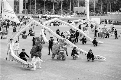 近年来,福建省晋江市大力弘扬中华优秀传统文化,将传统非遗体育项目列为校本课程,通过基础专业技艺训练、组织巡演和非遗进乡村等方式,让大学生在体育活动中锻炼身体,共享体育乐趣。图为12月14日,泉州轻工职业学院的大学生在进行非遗舞龙展示。