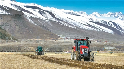 四川中烟向甘孜县生康乡捐赠的农机设备正在进行土地耕作。