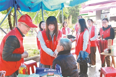 第六批全国岗位学雷锋标兵、第八届四川省道德模范蒲斌(左一)带领成都卷烟厂党员志愿者开展志愿服务活动。