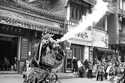 新年临近,四川省内江市东兴区开展川剧惠民巡演活动,让群众在家门口乐享戏曲“大餐”,丰富群众文化生活。图为12月16日,在内江市东兴区东兴街道东兴社区,川剧演员为群众表演川剧绝活变脸和吐火。