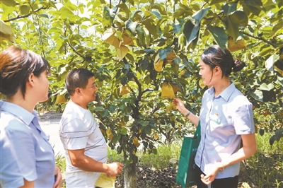 农行工作人员了解雪梨种植户经营情况。