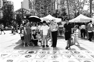市民在邛崃凤求凰公园通过趣味游戏学习文明交通知识。