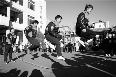 12月25日,江苏省连云港市连云区墟沟街道东园社区开展“活力‘新’生 运动同行”新就业群体元旦迎新冬季趣味运动会。运动会设置拔河、集体跳绳、企鹅漫步、袋鼠跳等比赛项目。来自美团、京东、顺丰等企业的快递员、外卖骑手踊跃组队参赛,在轻松欢乐的比拼中奋勇争先、舒展身心。图为新就业群体成员参与集体跳绳趣味比赛。