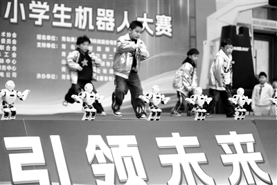 12月21日,山东省青岛市即墨区“英派斯杯”中小学生机器人大赛在即墨区第二中学举行。比赛由即墨区关心下一代工作委员会主办,来自全区中小学校的1200余名学生参加铁甲钢拳、智能车应急救援等20余个项目的角逐。图为学生与机器人一起参加表演。梁孝鹏 摄