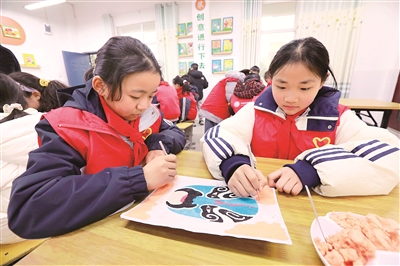近年来,湖北省竹山县宝丰镇红卫小学将纸浆画这项传统技艺创新性地引入课堂,让其成为“相守计划”主题绘画活动、课后服务社团的重要组成部分。图为12月15日,在红卫小学的纸浆画工作坊里,学生们正专注地创作着京剧脸谱纸浆画。