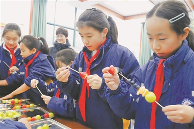 12月24日,浙江省湖州市吴兴区戴山学校的餐厅里,学生们在老师的指导下制作传统美食糖葫芦。大家串果、熬糖、蘸糖、冷却,在劳动中传承民俗,在甜蜜中感受暖意。图为学生们在制作糖葫芦。金新林 摄