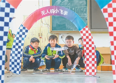近年来,湖南省永州市道县第四小学积极创新课后服务模式,精心打造多元化无人机特色课程,让学生直观感受科技的魅力,体验科技带来的快乐。图为12月16日,学生在学习无人机操作技术。蒋克青 蒋正争 摄