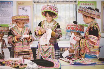 近年来,贵州省黔西市太来彝族苗族乡院子小学开展“非遗刺绣进课堂”活动,每周开设刺绣特色课,邀请民间刺绣艺人来到学校向学生传授刺绣技艺,让学生感受非遗魅力。图为12月16日,学生在民间刺绣艺人的示范和指导下学习刺绣技艺。周训超 摄