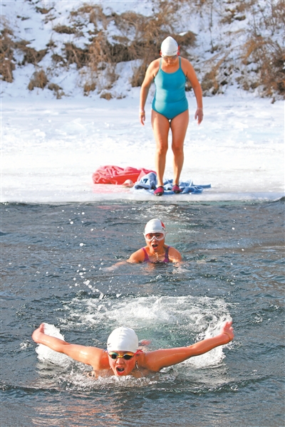 冬季以来,内蒙古自治区呼伦贝尔市“冰雪那达慕”“大众冰雪季”“冰雪英雄会”等活动让冬日冰雪运动持续升温,老年朋友们纷纷走出家门,通过滑冰、冬泳、滑雪等活动,乐享冰雪运动,拥抱健康生活。图为1月7日,在扎兰屯秀水国家湿地公园冬泳基地,老人们体验冬泳乐趣。韩颖群 摄