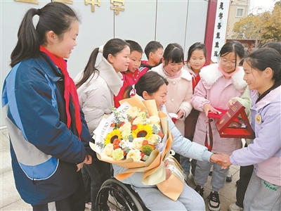 近日,“湖北省自强模范”、轮椅竞速运动员张园走进湖北省竹山县宝丰镇宝丰中学,开展题为“自强不息·筑梦青春”的事迹报告会,向2000余名师生分享了她十余年的奋斗历程。图为张园和孩子们互动。