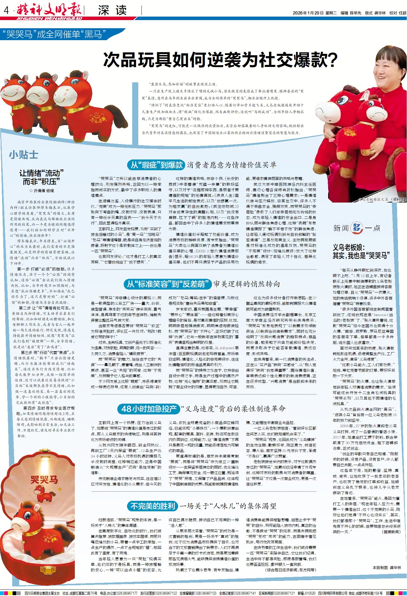 在她看来,“哭哭马”能火,是因为懂打工人的委屈。“现在年轻人压力大,需要一个情绪出口,这个不完美的小马,刚好让他们觉得‘不开心也没关系’。其实,我们都是那个‘哭哭马’,工作、生活中难免有不开心的时候,但要相信总会迎来逆袭的一天。”(据潮新闻)