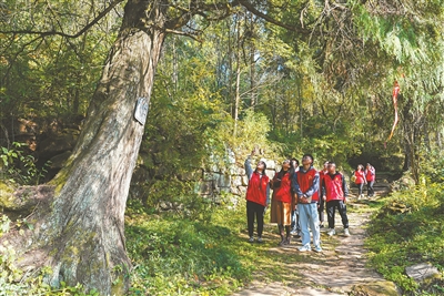 “大蜀道·蜀小兵”志愿服务队志愿者监测古柏生长情况。(中共剑阁县委宣传部供图)