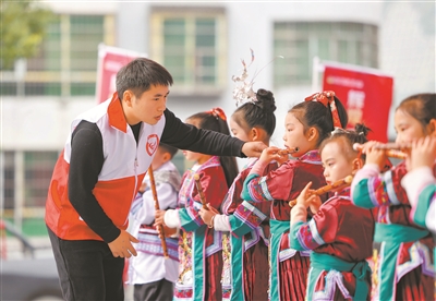 近年来,贵州省铜仁市玉屏侗族自治县团委联合县文联,组织竹笛吹奏志愿者,利用周末、节假日等时间,推出“竹青声”竹笛公益课堂,免费指导少年儿童学习竹笛吹奏,丰富精神文化生活,深受广大少年儿童及家长赞誉。图为1月17日,少儿学员在竹笛公益课堂汇报展演活动上吹奏竹笛。胡攀学 摄